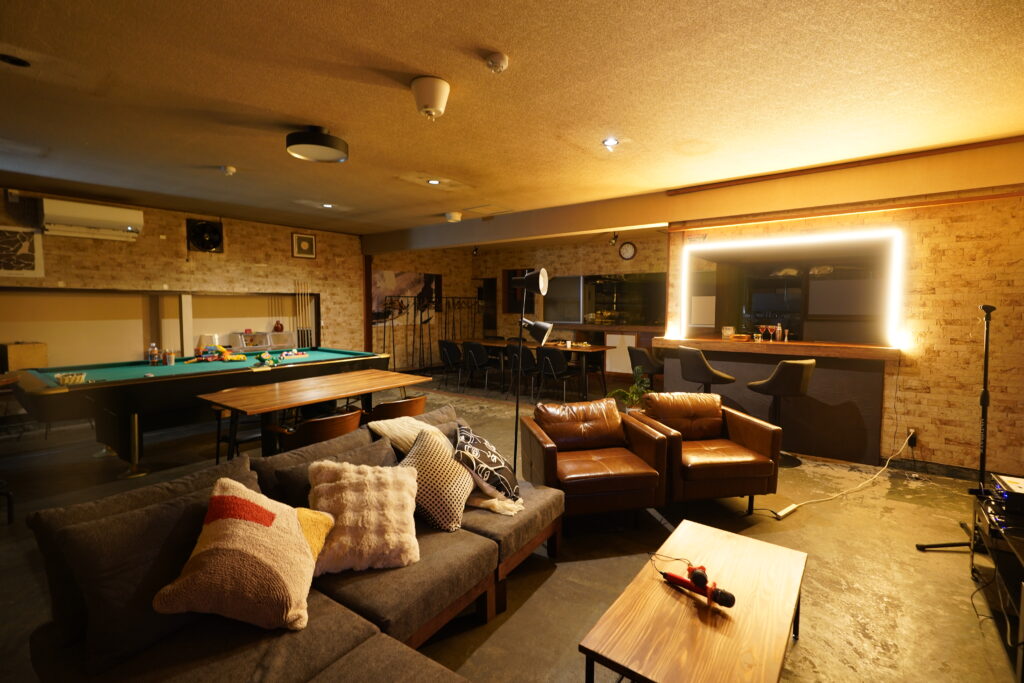 ビリヤード、カラオケ、ダーツ、BBQグリル(トング付)、テレビ、掃除機、調理器具、食器、マグカップ、グラス、電子レンジ、炊飯器、冷蔵庫、電気ケトル、ヘアドライヤー、ハンガー、アイロン、Wi-Fi、etc
